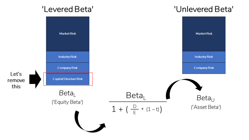 This formula takes you from Equity Beta by accounting for the Debt-to-Equity Ratio and the Tax Rate to arrive at Unlevered Beta.